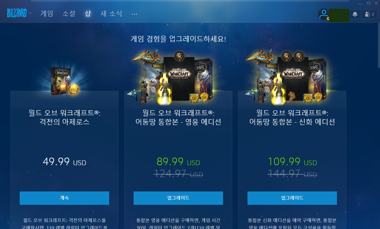 이중 본인에게 맞는 패키지를 선택하면 된다. 나같은 경우는 영웅에디션을 구매하였는데 이는 두개의 레벨 부스트와 어둠땅 예약구매,클래식 이용권등이 합처진것에 비해 가격이 효율적이라 선택하였다.