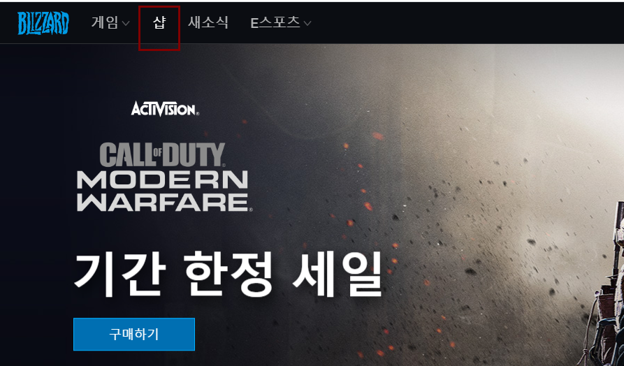 우선 미국 블리자드로 로그인하고 메인화면에서 대분류 메뉴 샵(shop)을 눌러 들어간다.